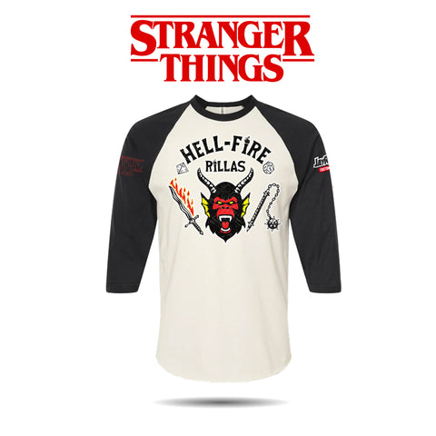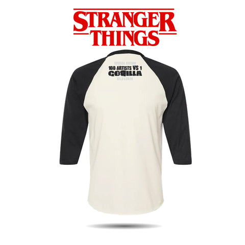 The centerpiece features a demonic gorilla sigil crowned with horns, flanked by flaming steel and spiked chains—an homage to tabletop chaos, basement campaigns, and the fearless kids who fought monsters with imagination and loyalty. Set on a classic raglan baseball tee, this design feels like a band shirt from a tour that never ended.