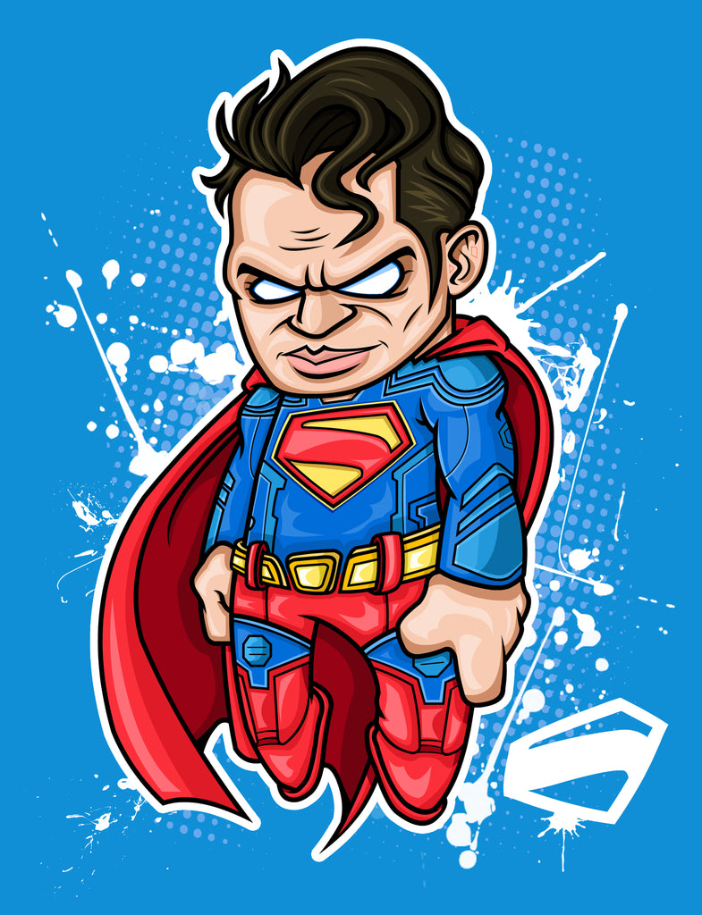 Front and center is a chibi-styled powerhouse hovering mid-air—cape flowing, fists clenched, and confidence locked in. Set against electric splatter textures and heroic blues, this design captures that timeless feeling of strength, responsibility, and rising above when the world needs it most.