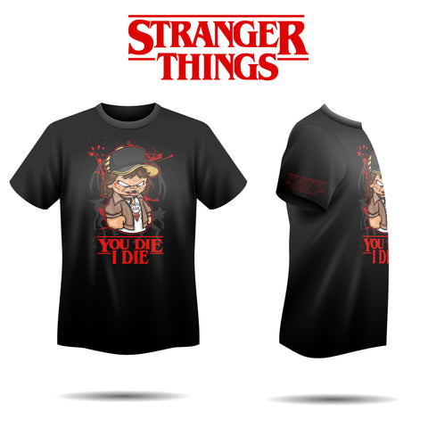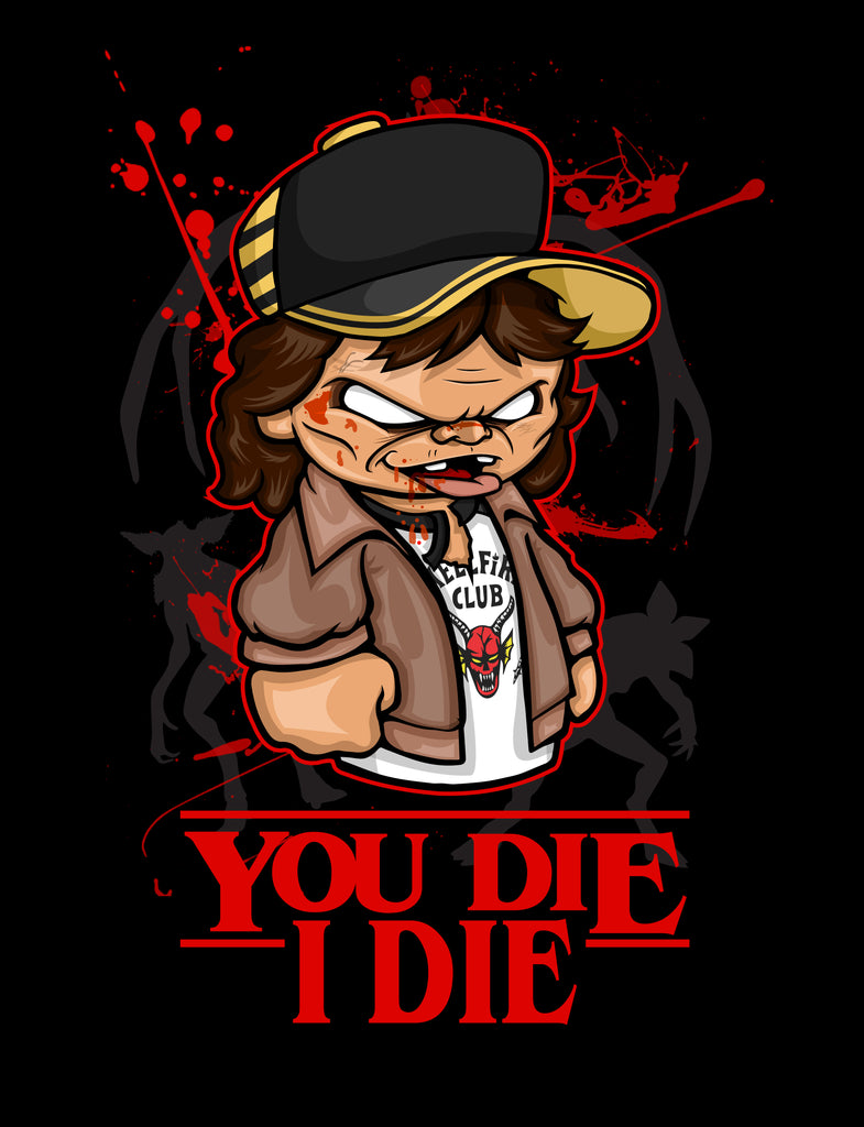 The design features a tough, cartoon-styled sci-fi adventurer rocking a trucker cap, curled hair, and an unbreakable attitude. Splattered with gritty red accents and anchored by the ominous phrase You Die, I Die, this tee captures that perfect mix of friendship, fear, and fearless loyalty that defined a generation of 80s horror nostalgia.